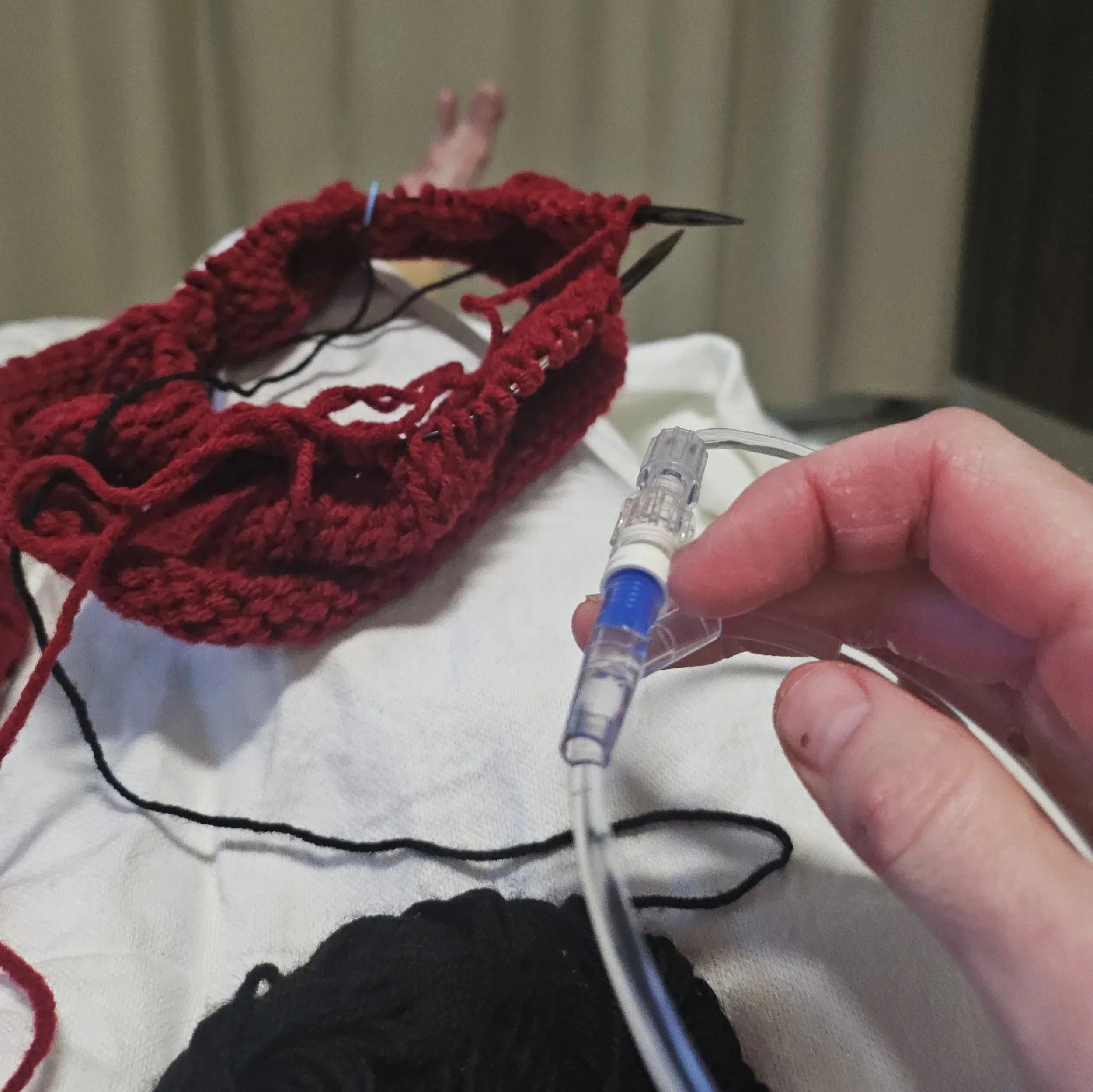 I brought my knitting to the emergency room in a (fairly futile) attempt to take my mind off of the situation. At this point, I still didn’t know whether I’d be able to keep my leg or not.