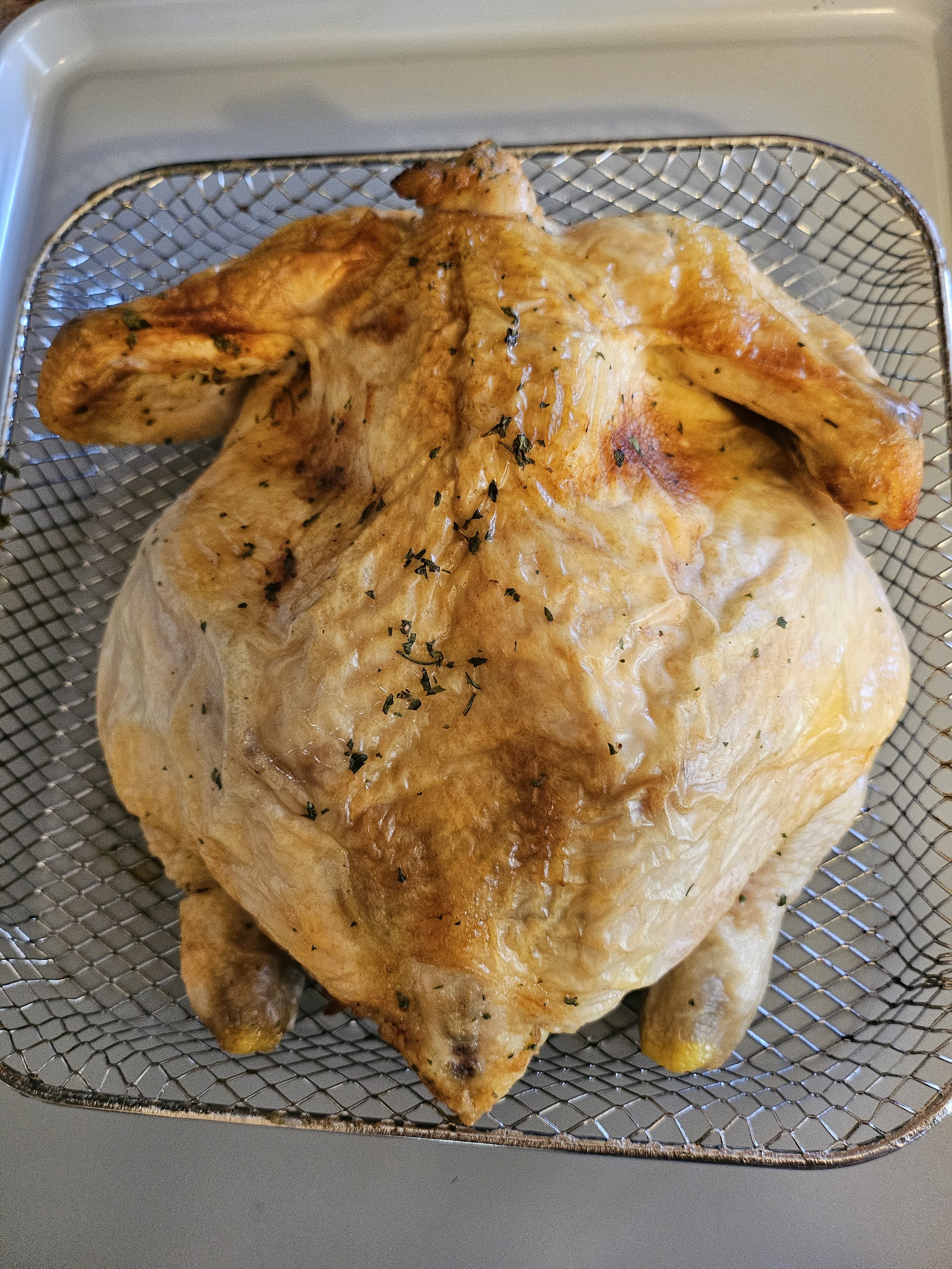 Season the chicken with Pork King Good and salt as desired. If using a conventional oven, line a baking sheet with parchment paper and place the chicken on top of a cooling rack on top of that, ensuring air circulation on all sides of the chicken. If using the Gourmia air fryer, place the chicken on lower tray, removing the top tray. Bake at 275°F for 60 minutes.
