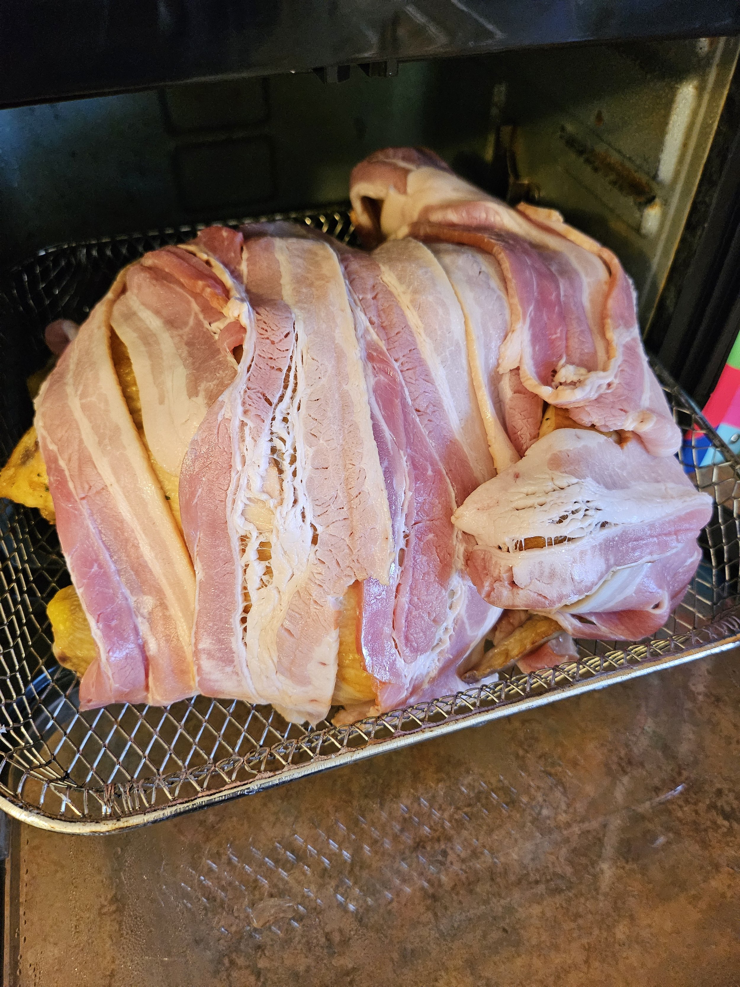 Remove the par-cooked chicken and wrap it thoroughly in bacon, ensuring the wings are wrapped separately. Place back into oven and bake at 350°F for 60 minutes, or until a thermometer inserted into the center reaches 165°F.