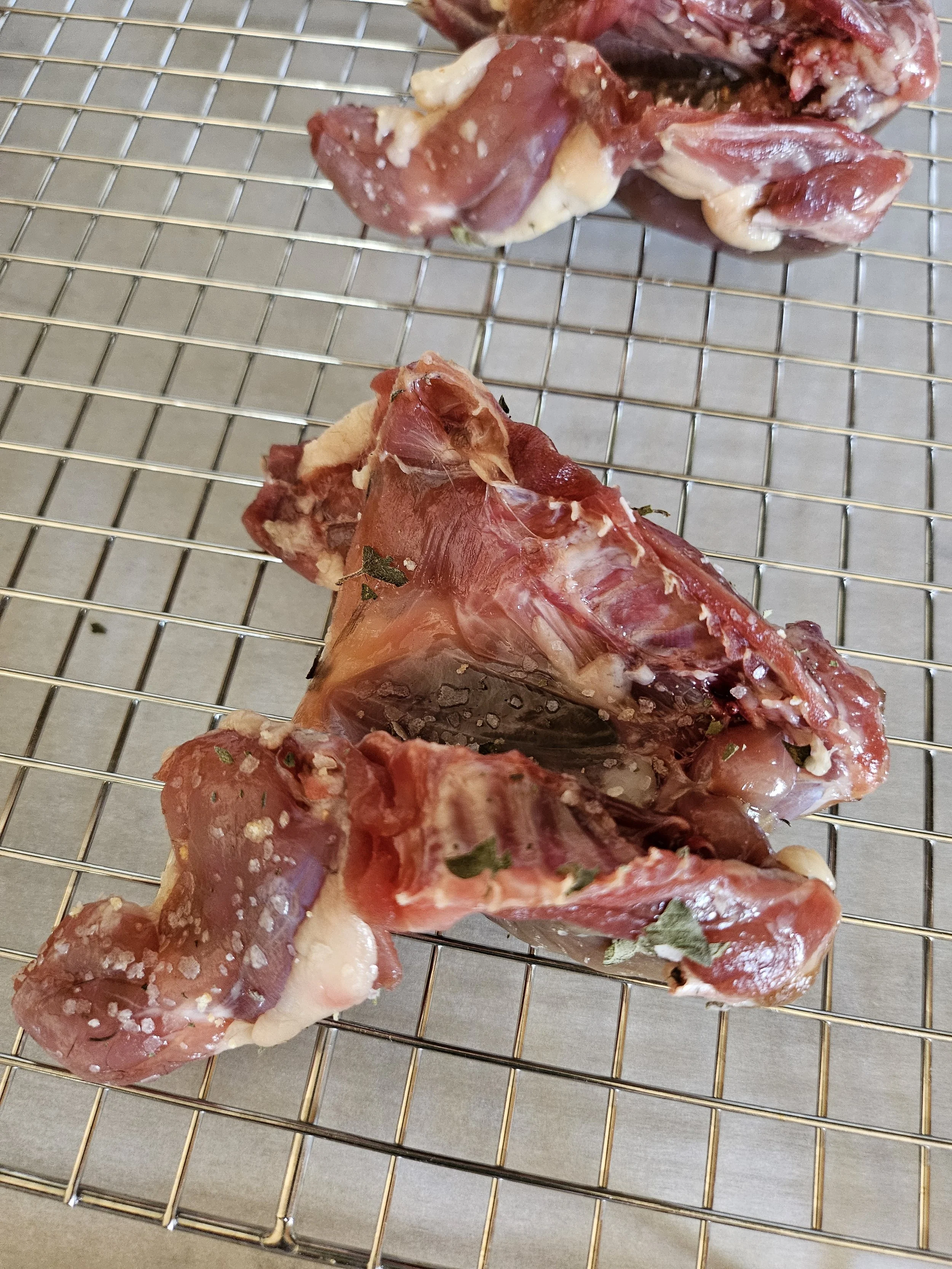 Place the quail cavity side up on the cooling rack. Bake for 30 minutes at 350°F. After 30 minutes, without removing the tray, increase the temperature to 425°F and bake for another 10 minutes.