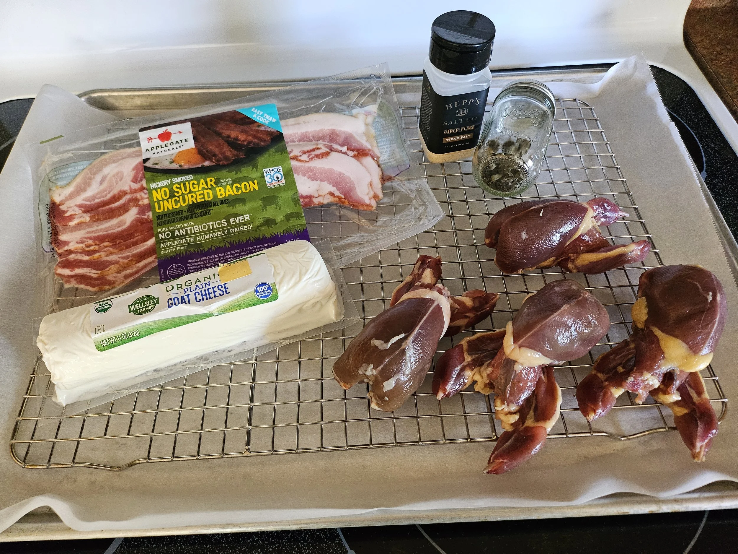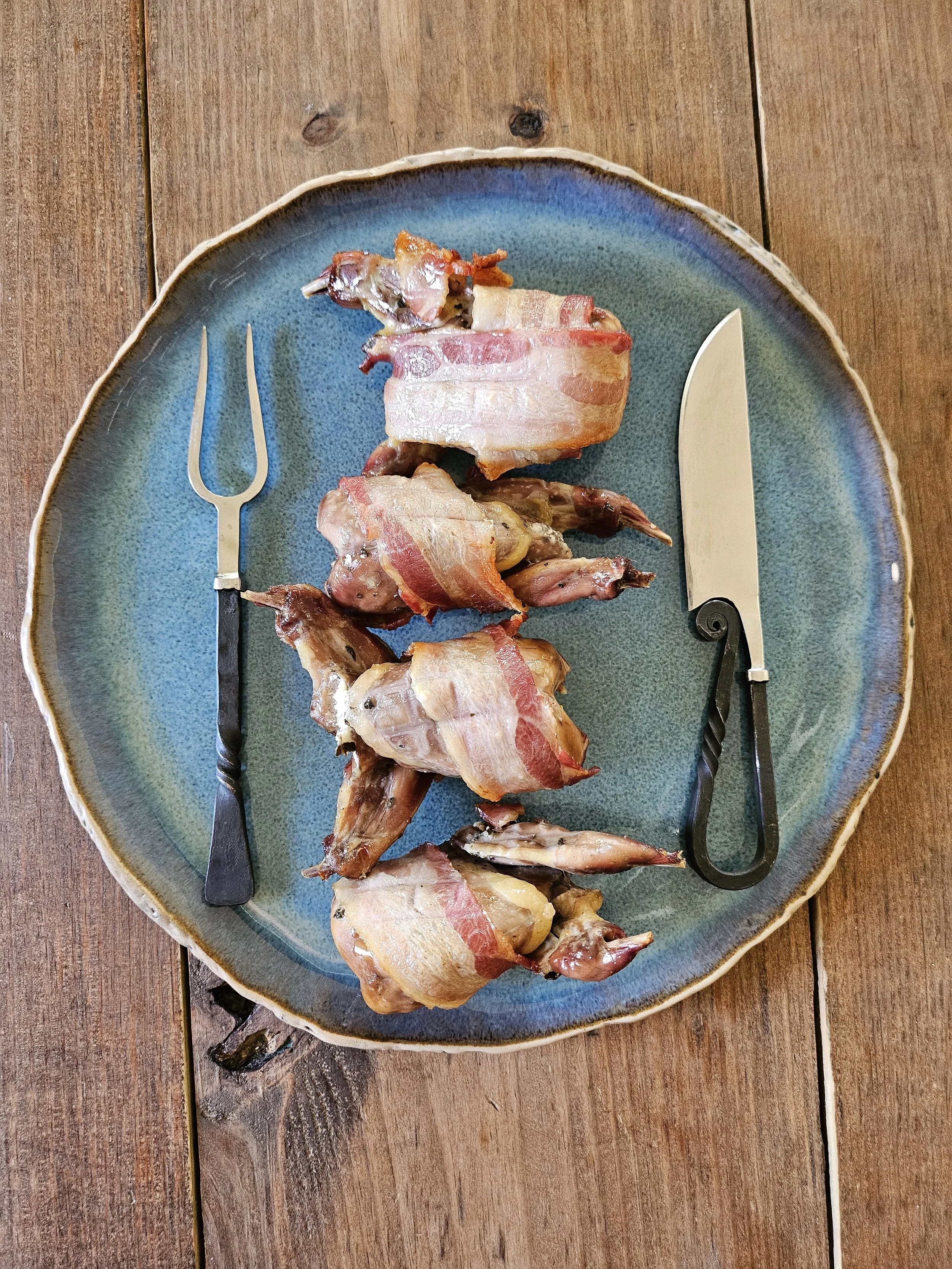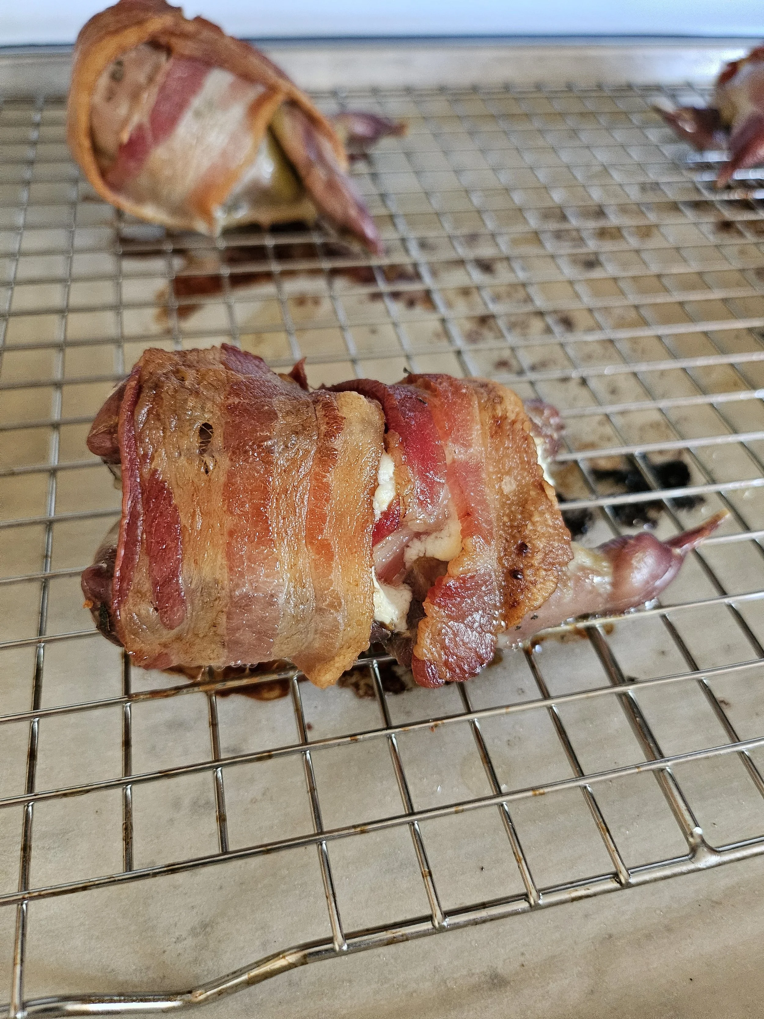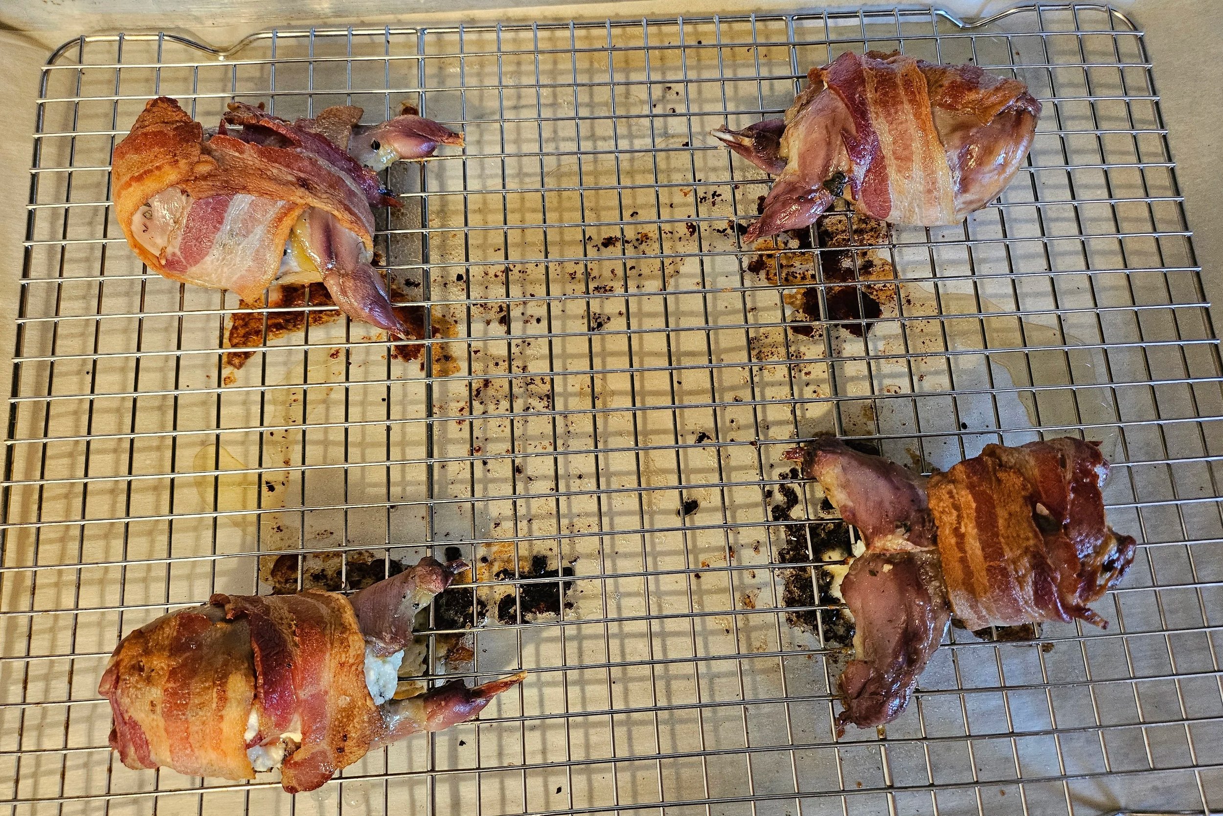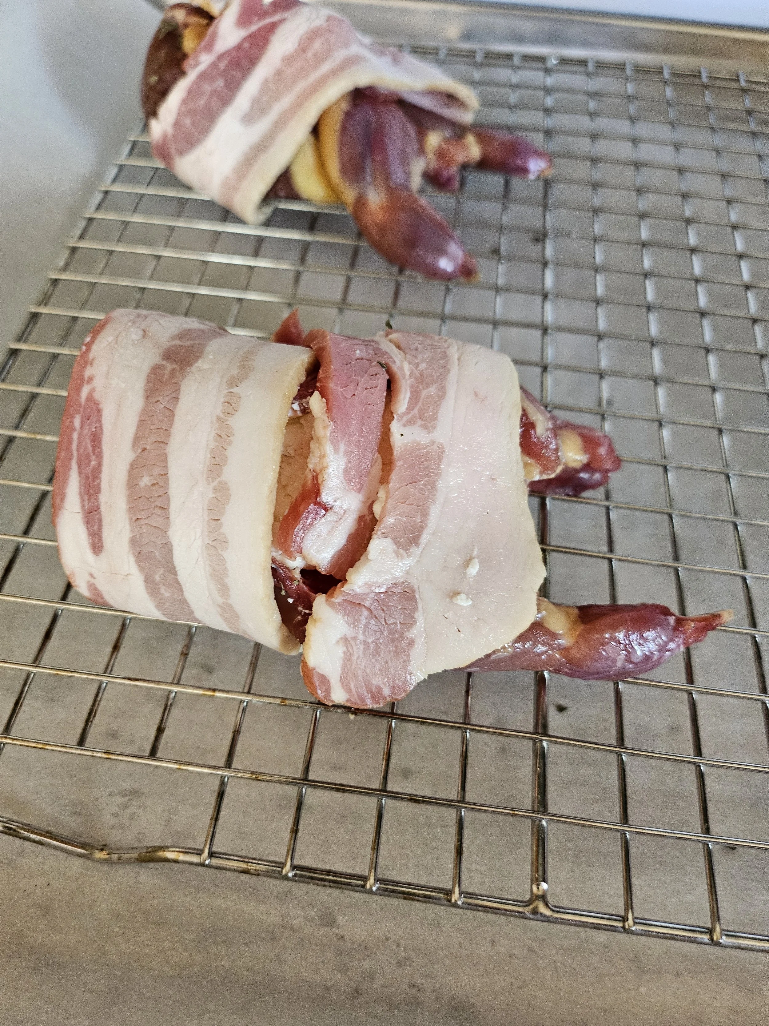 Wrap each quail with two slices of bacon - I recommend wrapping one slice lengthwise and one widthwise.