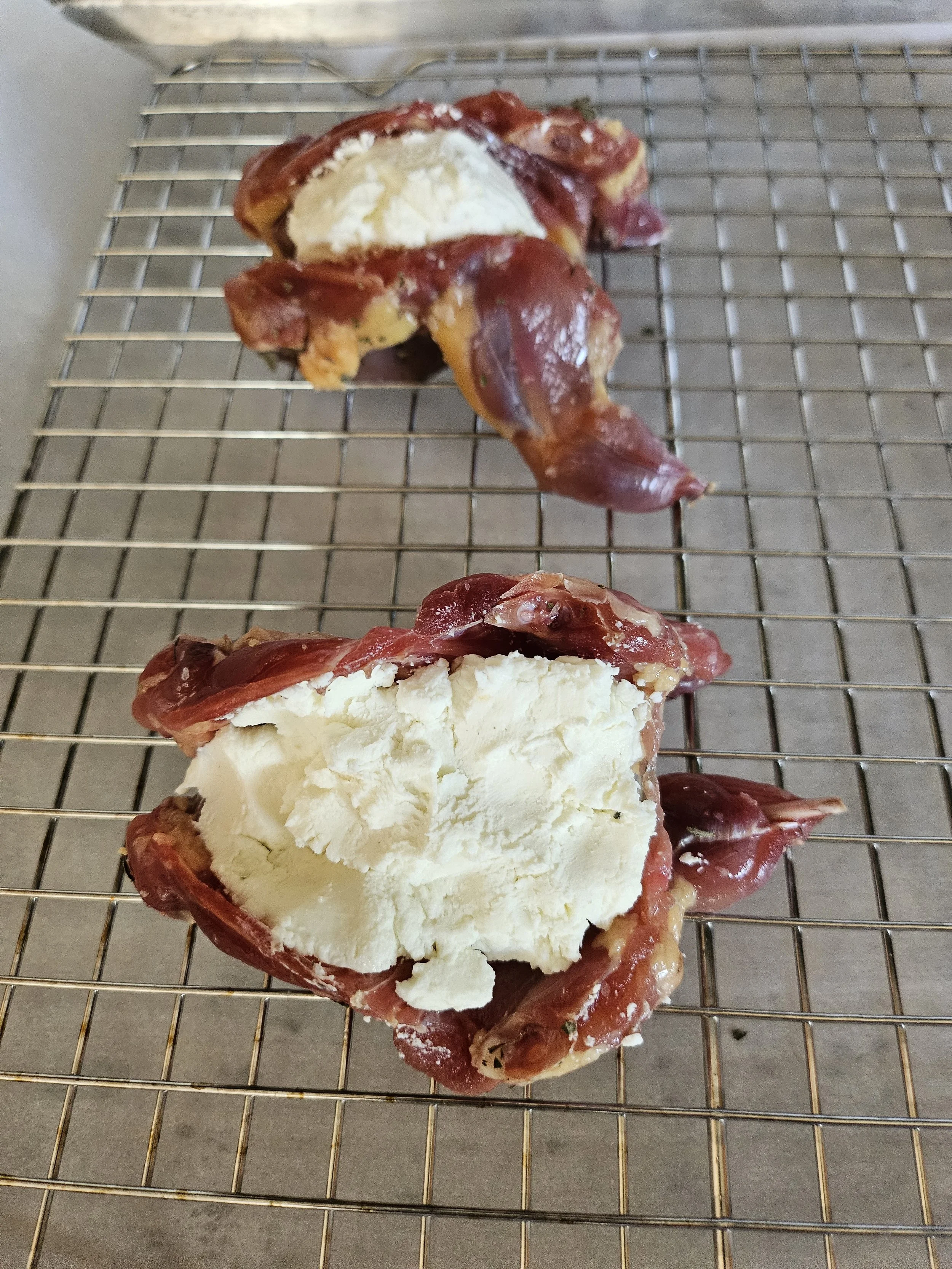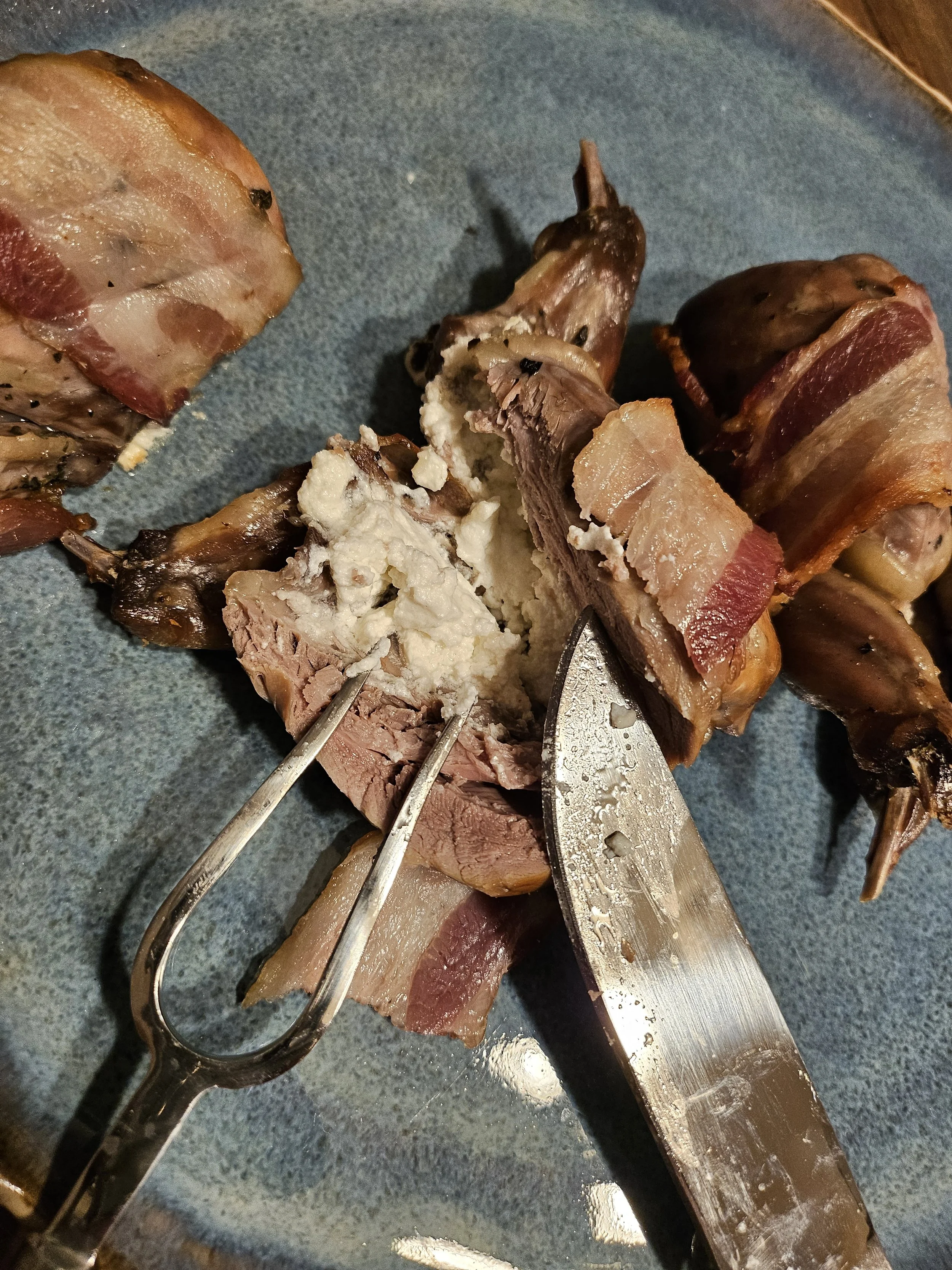 Divide the goat cheese into four portions and press each portion into the quail’s body cavity.